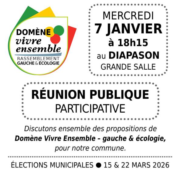 📣Après les porte-à-porte à la rencontre des Doménois·es et les multiples séances de travail de nos candidats et sympathisants, nous vous convions à une réunion publique participative, le mercredi 07/01 à 18h15 dans la grande salle du Diapason. Venez nombreux pour échanger sur nos propositions ! La réunion sera suivie d’un temps convivial autour d’un buffet partagé. D’ici là nous vous souhaitons de passer de bonnes fêtes de fin d’année 🎉